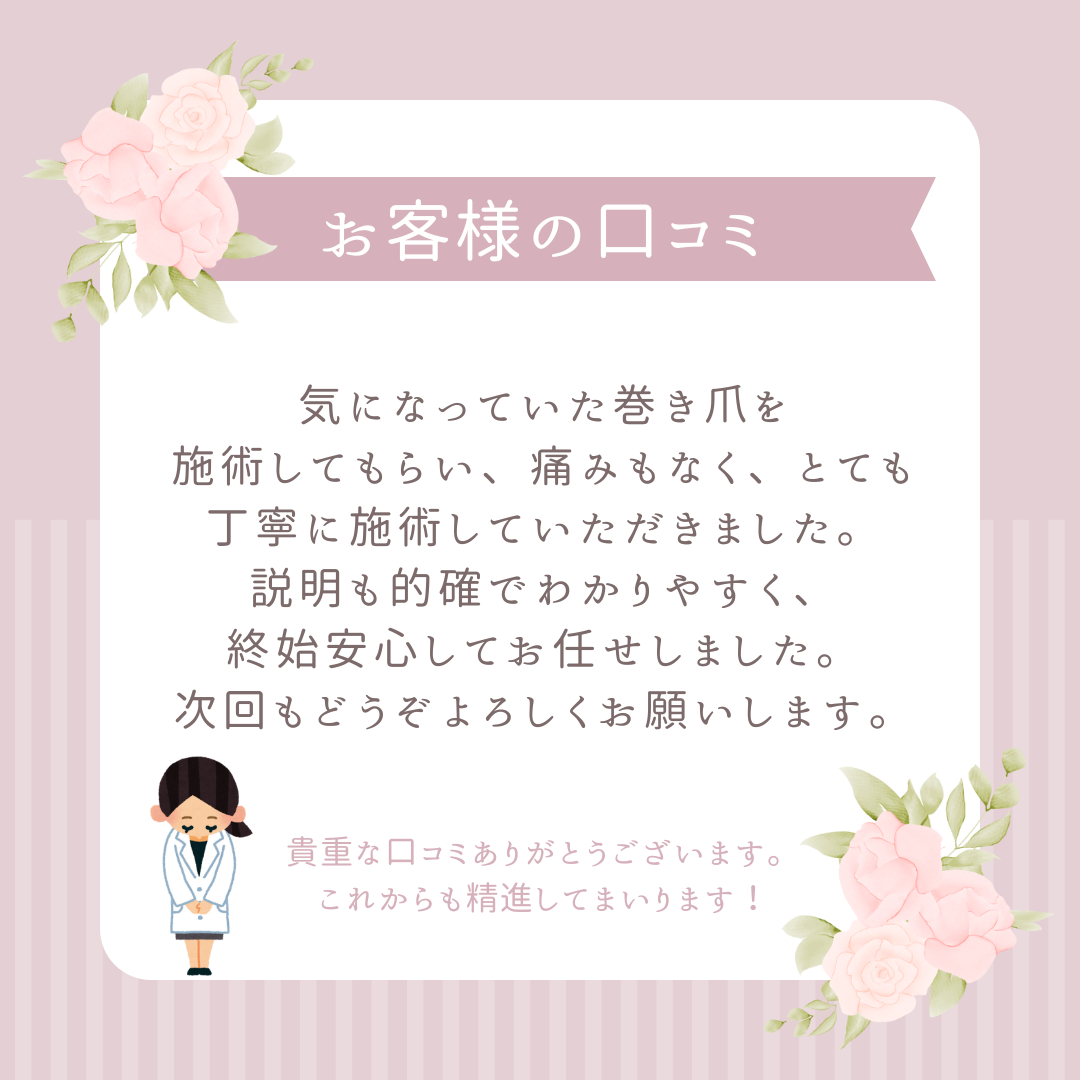 巻き爪にお悩みのお客様で、巻き爪補整B/Sスパンゲの施術を行ったお客様からの口コミでした。