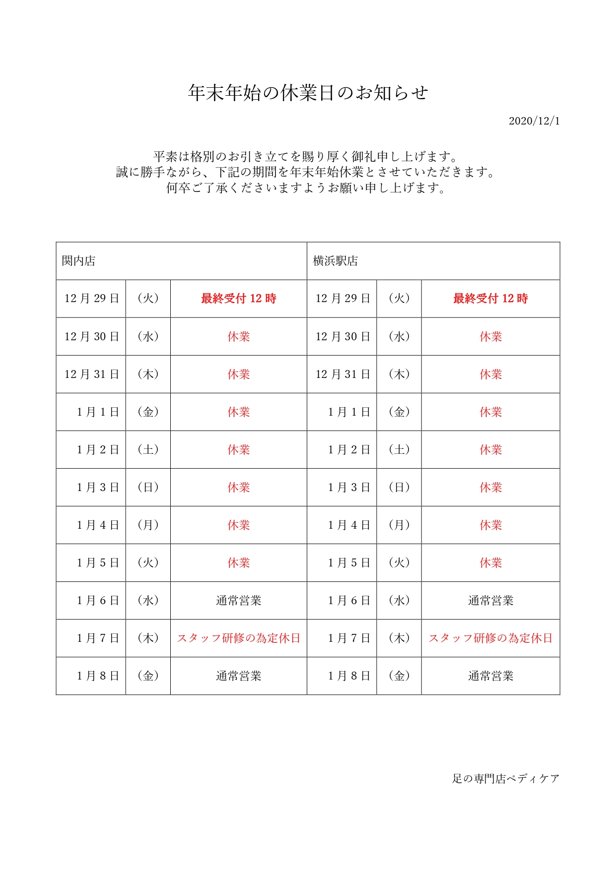 関内店、横浜駅店ともに、2020年12月29日(火)年内最終受付12時とさせていただきます。